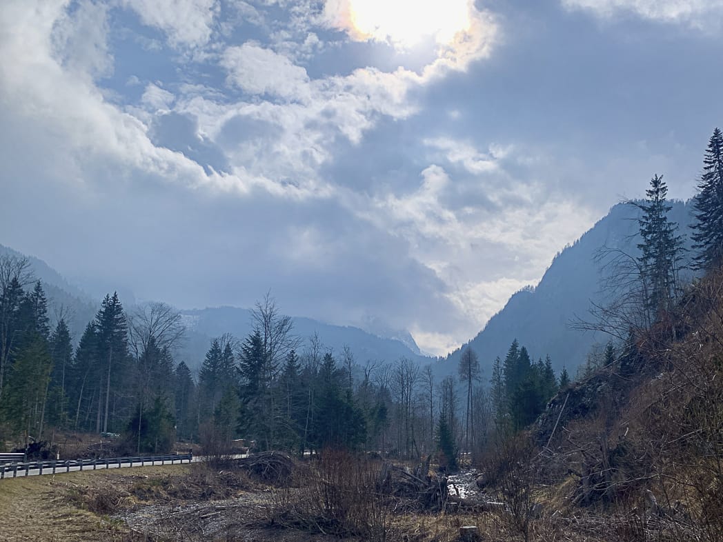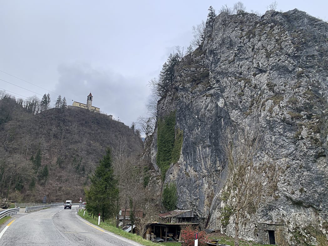 Die Planung mit Komoot weist 1300hm auf, die heute zu überwinden sind. Komoot mag es zu Beginn lustig und schickt uns auf Schotter durch einen Wald und über ein ausgetrocknetes Flussbett. Wir kommen ins Tagliamento-Tal, ohne den Fluss zu sehen. Bei Villa Santina erreichen wir den tiefsten Punkt unserer Reise (360m) und könnten locker über Tolmezzo ins Kanaltal wechseln und dort den Zug nehmen (geht aber nicht). Also auf nach Norden: Wir wechseln ins Deganotal auf die SR355. Sanft geht es bergauf, bis Comeglians.