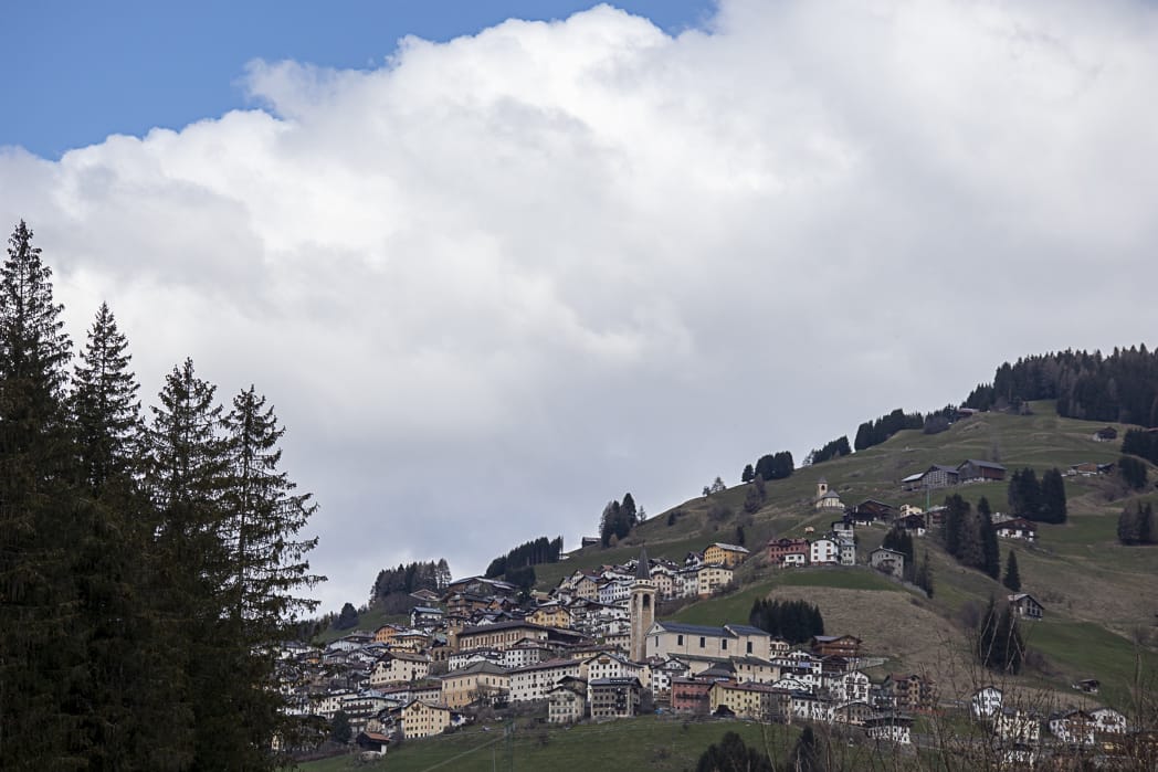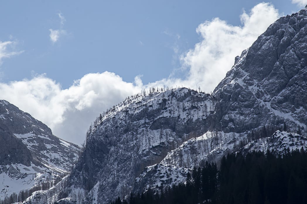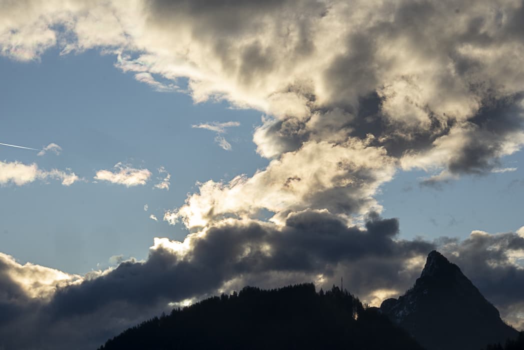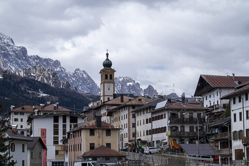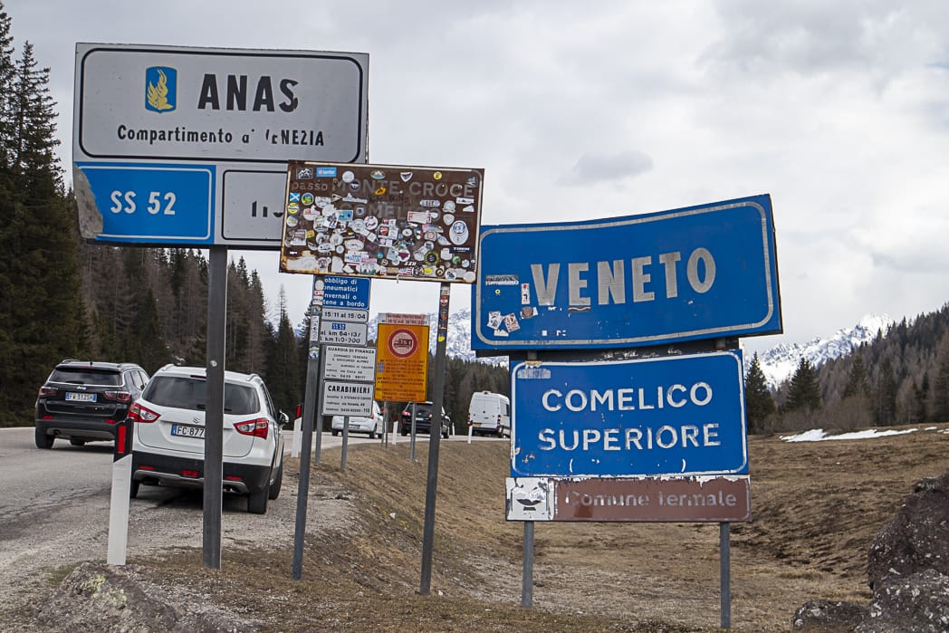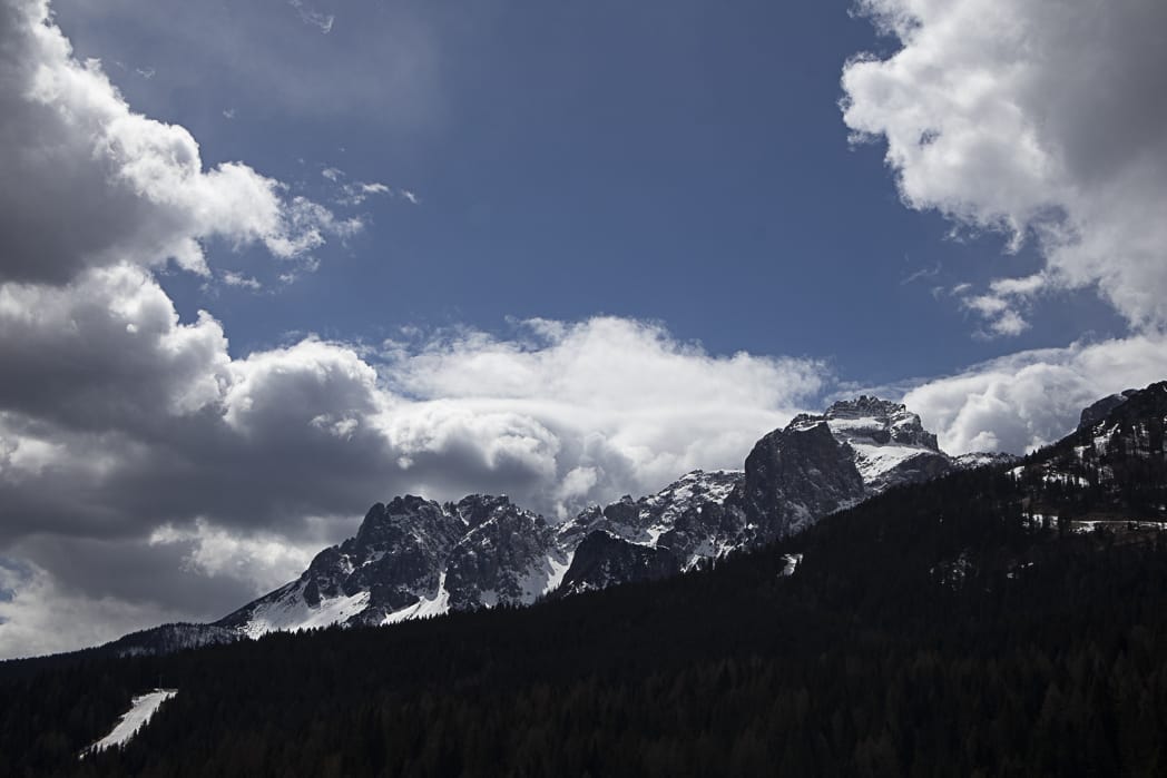 Wir packen uns so ordentlich ein, dass uns nach kurzer Zeit viel zu warm in der Sonne ist. Eine fetzige Abfahrt nach San Stefano di Cadore. Das war’s dann auch schon. Der Kreuzbergpass wartet auf uns. Wir entscheiden uns, nach Anschauung des Tourenprofils, für die normale Straße. Kurzes Innehalten in Dosoledo, ein schöner Bergort an der Talschulter. Herrliche Wolkenstimmungen! Nach eine flachen Strecke folgt der Anstieg auf den Pass, wieder Tornanti, gewürzt durch einen kleinen Wasserfall am Wegrand.