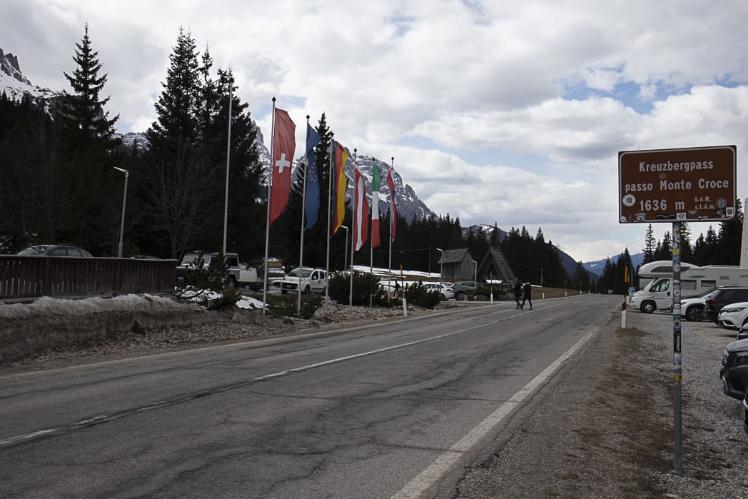 Am Pass treffen wir laufende Schilifte und Schifahrer:innen in Aktion. Es ist kalt, also alle Körperteile wieder gut einpacken und die smarte Abfahrt genießen. Wir sind wieder in Südtirol gelandet. In Sexten wollten wir essen, fanden aber kein Lokal, nur Hotels (wieder der exzessive Tourismus!). Die offene Pizzeria umgehen wir, davon hatten wir ja schon genug…