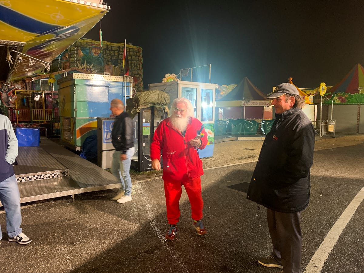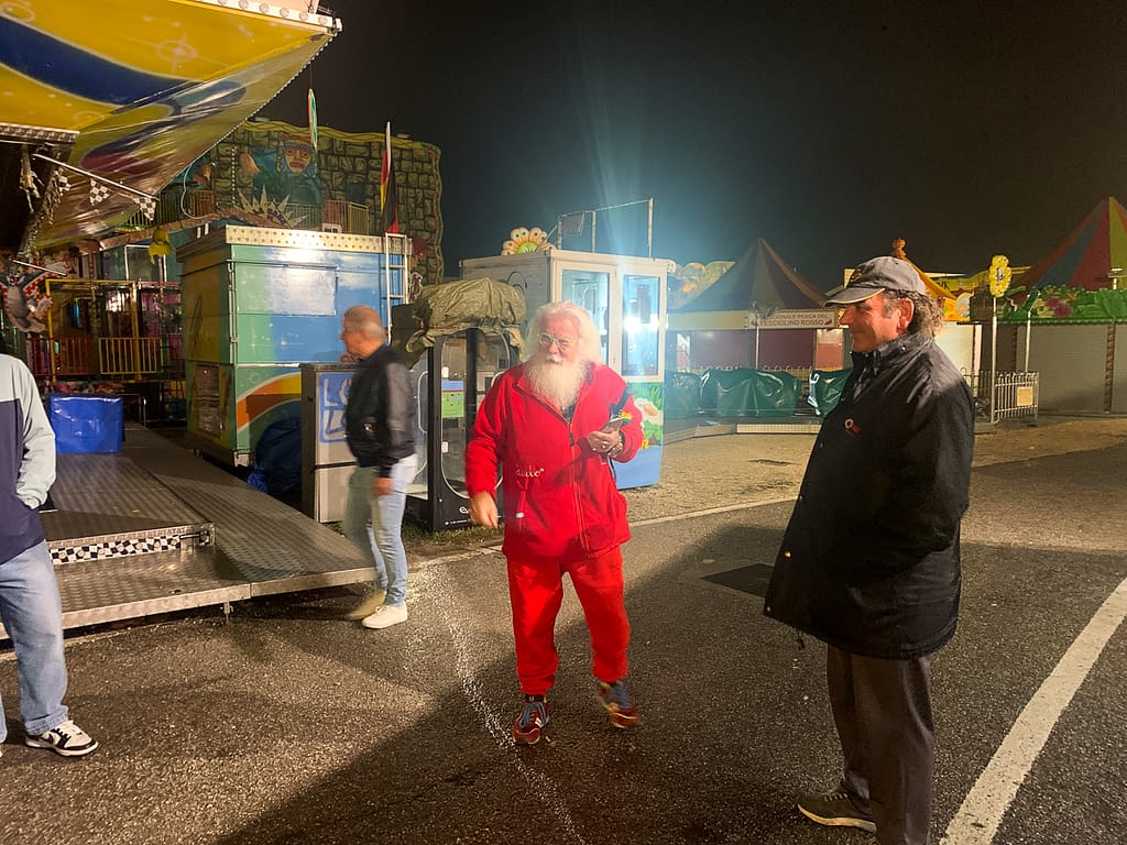 Wir sind nach dem Check-In nicht mehr sehr motiviert, die Stadt zu erkunden. Aber es gibt einen Jahrmarkt – Fiere di San Luca – in der Nähe, wo es abgesehen von den unvermeidlichen Zuckerdingen auch richtiges Futter gibt, Frittelle und Patatine oder Bausatz-Panini zum Beispiel. Während wir uns den Bauch vollschlagen, tritt ein Nikolaus auf – der erste dieses Jahr 😉