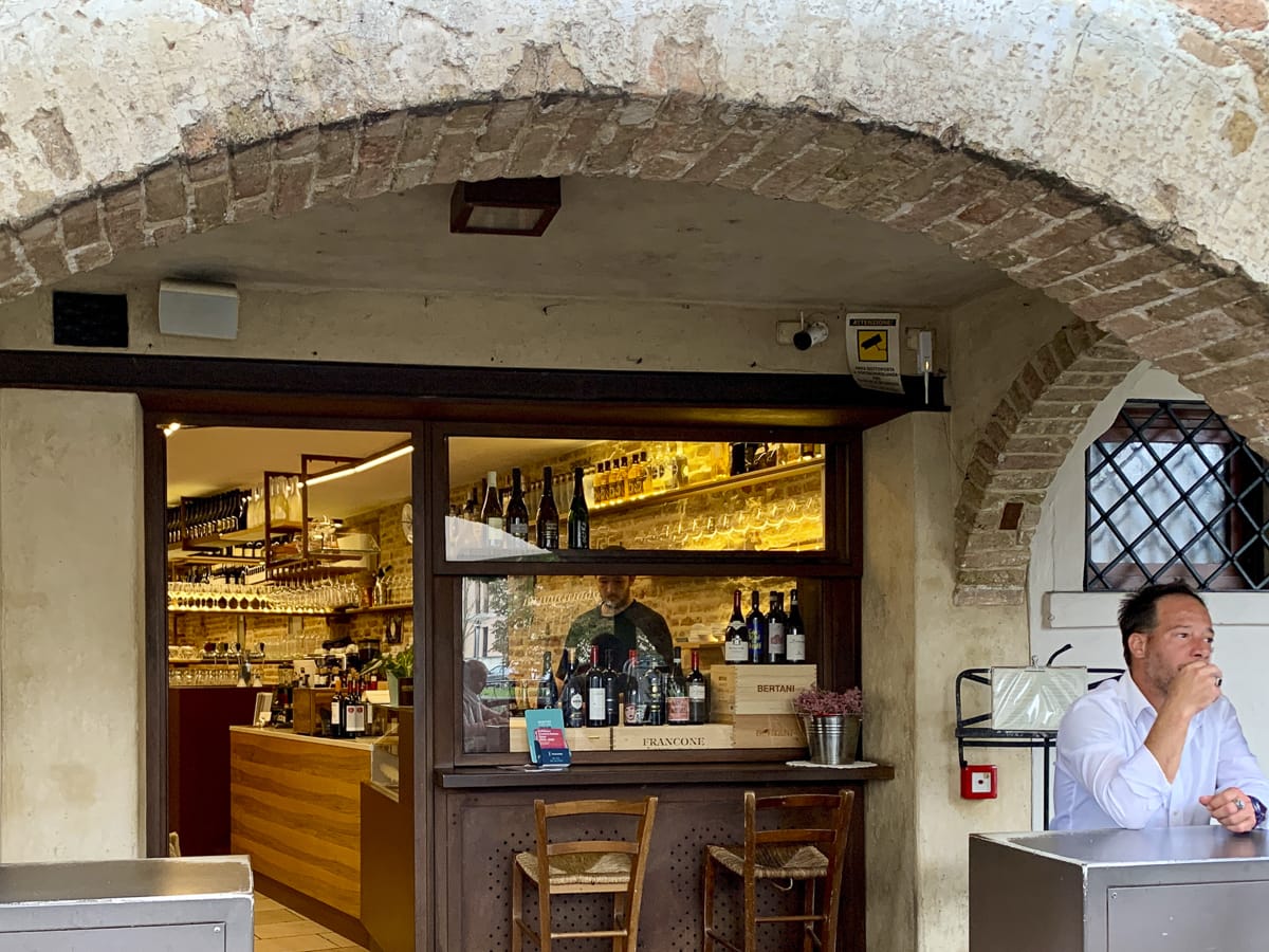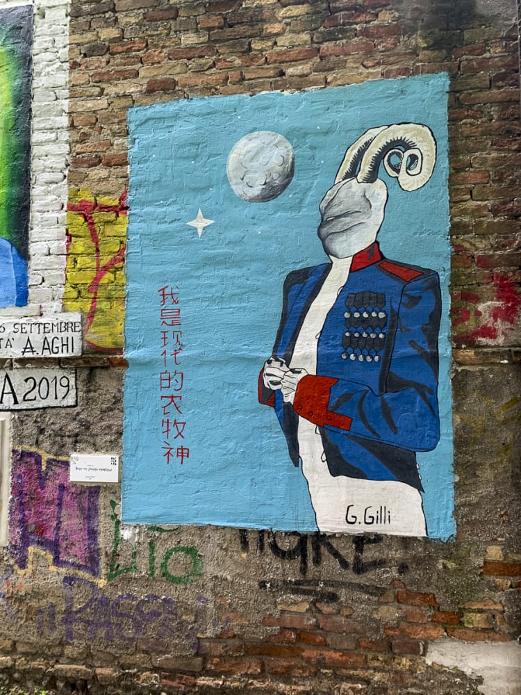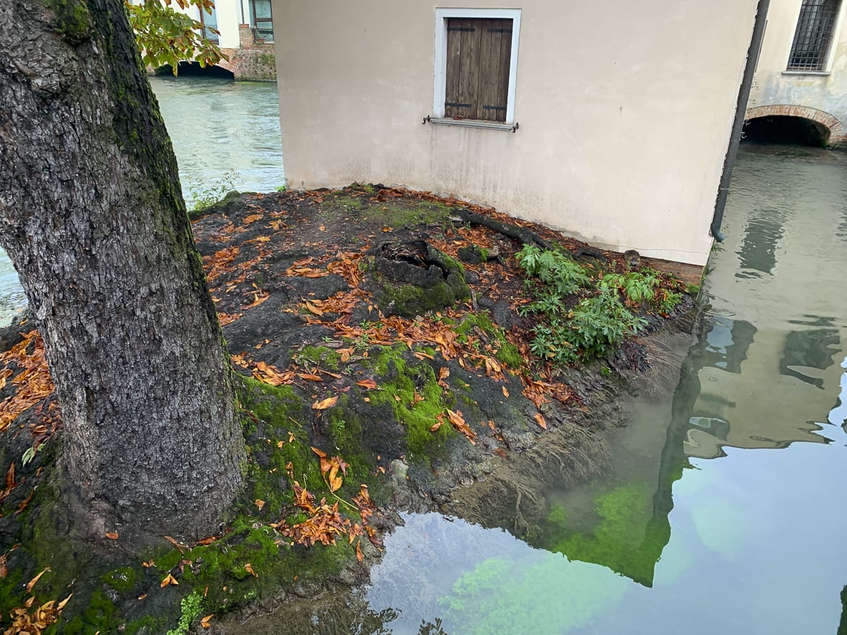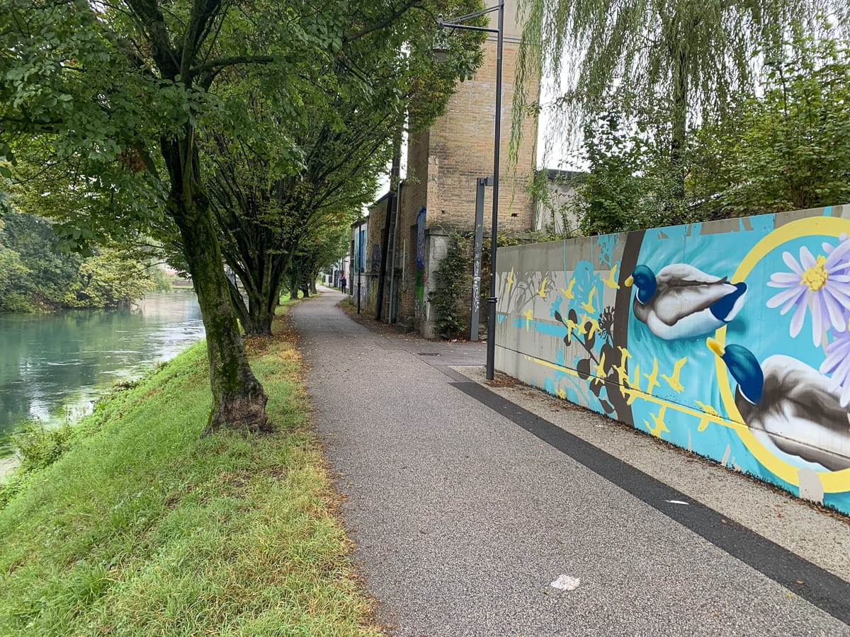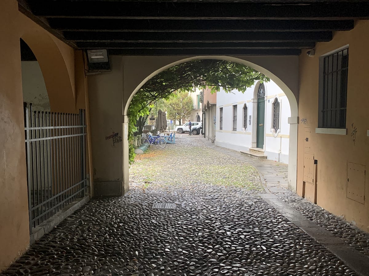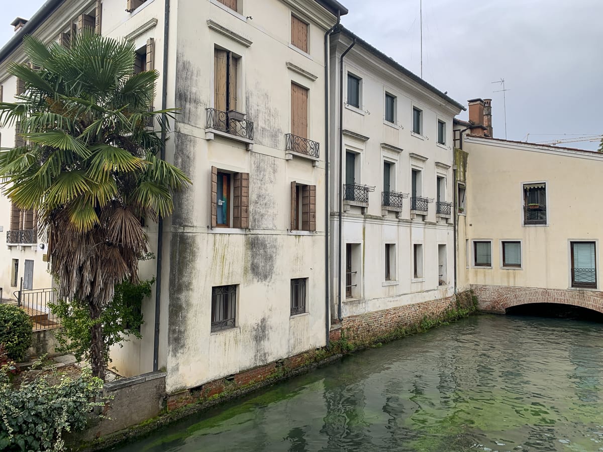 In Treviso angekommen. Am Bahnhof brüllt ein Dunkelhäutiger gefährlich aggressiv herum und stänkert Passant:innen an, ich sehe zu, dass ich außer Reichweite komme. Auf dem Weg zum Hotel 3 Santi schüttet es, als wir an einem Kanal entlang fahren, meinem Ohrhörer geht der Strom aus, als keine Navigation mehr, ich verliere D., dann schaff ich es doch zum Hotel.