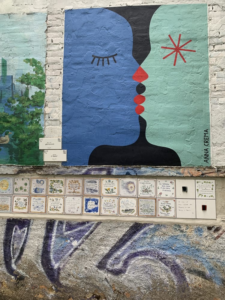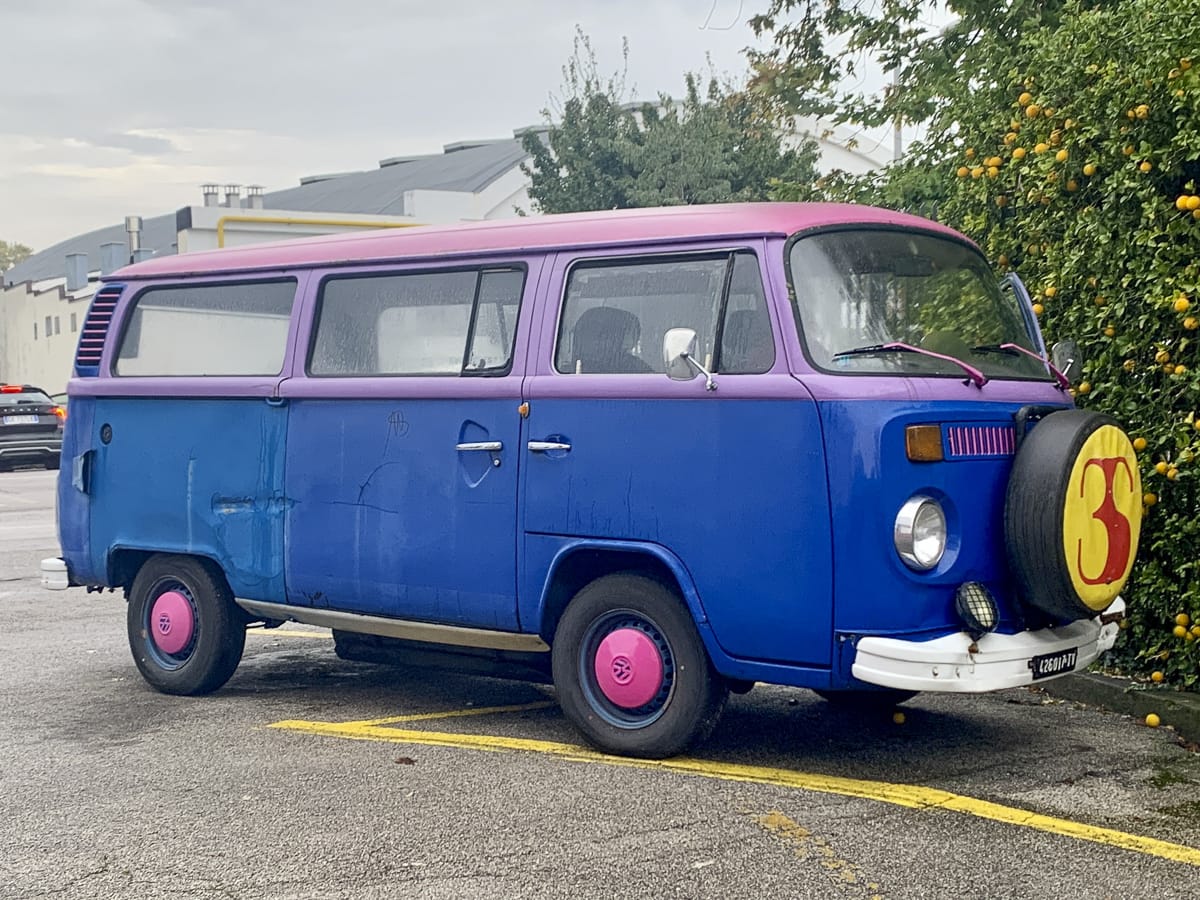 Das Frühstück: Italienisch, Croissant und Espresso. Aber: Serviert vom Künstler himself, der mit kleinen Schritten so um die Bar zuckelt, dass man um das Frühstück bangt. Sein Äußeres passt perfekt zur Umgebung, pinkes Jackett, bunte Hose, schlohweißes Haar; irgendwie erinnert er an einen Hofnarren bei den Medici. Und wieder bin ich zu feig, um ein Foto zu bitten, schade. Bald nimmt er sich einen passenden Schirm, wuselt zu seinem Bus, schafft es mit Mühe, einzusteigen – und ja, der Motor springt tatsächlich an! Überraschend entschlossen gibt er Gas und fährt los.
