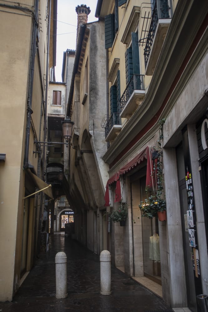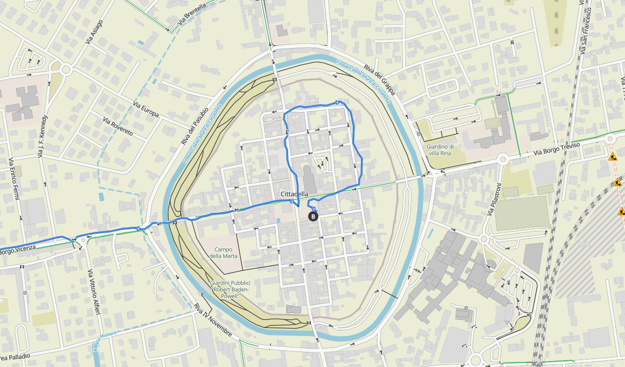 Am Ortsende von Vicenza der obligate Kaffee. Es ist trüb und könnte jederzeit zu regnen beginnen. Wir strampeln Richtung Citadella, einfach nur treten. Ein Mal fahren wir ein Stück weit auf der SS53 und schaffen es beinahe nicht, diese zu überqueren, treffen einen Radler, der uns stolz seine Armprothese zeigt. Tatsächlich bremst ein Auto und lässt uns über die Straße.
