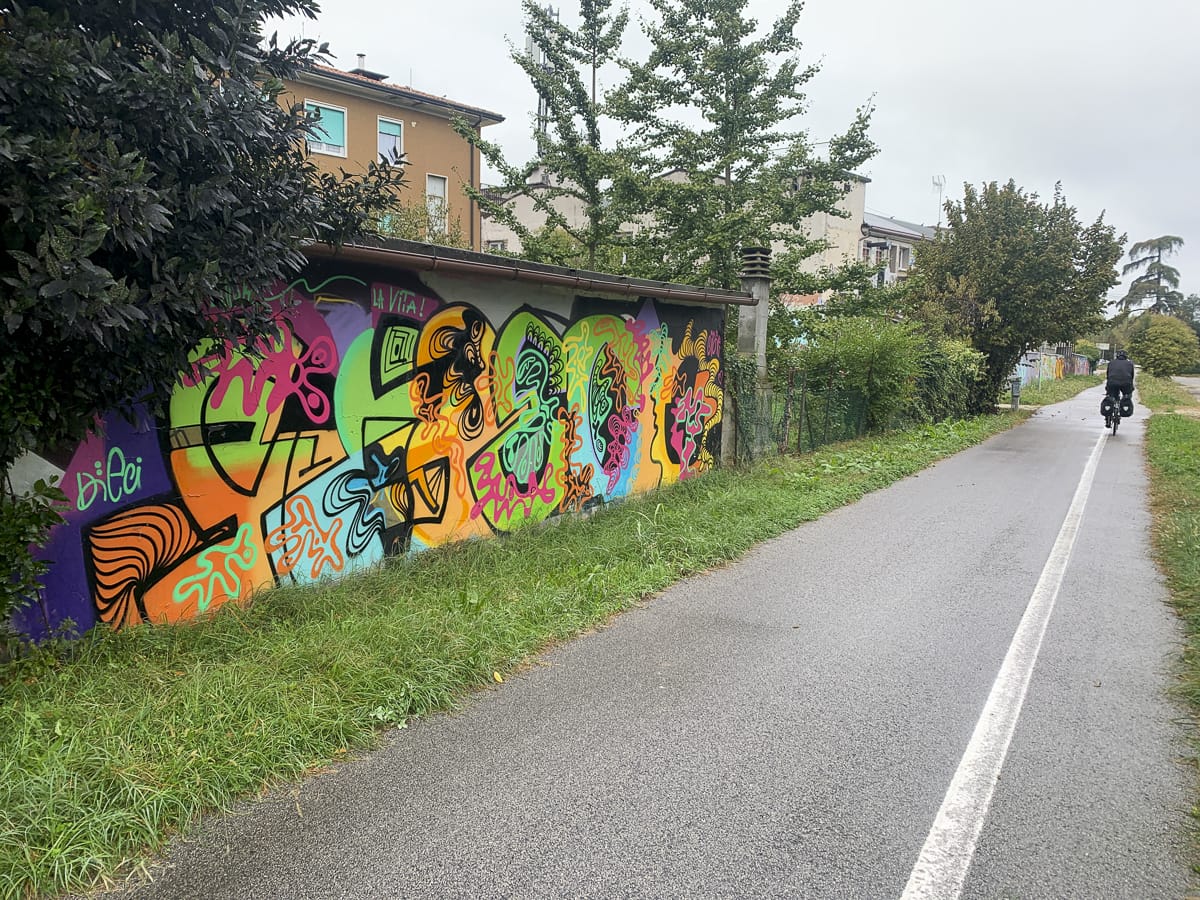 Wir nehmen Abschied. Ein Zettel auf den Frühstückstisch mit Abschiedsgrüßen an Vittorio. Es geht nach Treviso, weil von dort aus Mestre auch passabel bei schlechtem Wetter mit dem Rad zu erreichen ist. Schließlich gibt es noch keine Klarheit über den Streik der Eisenbahner.