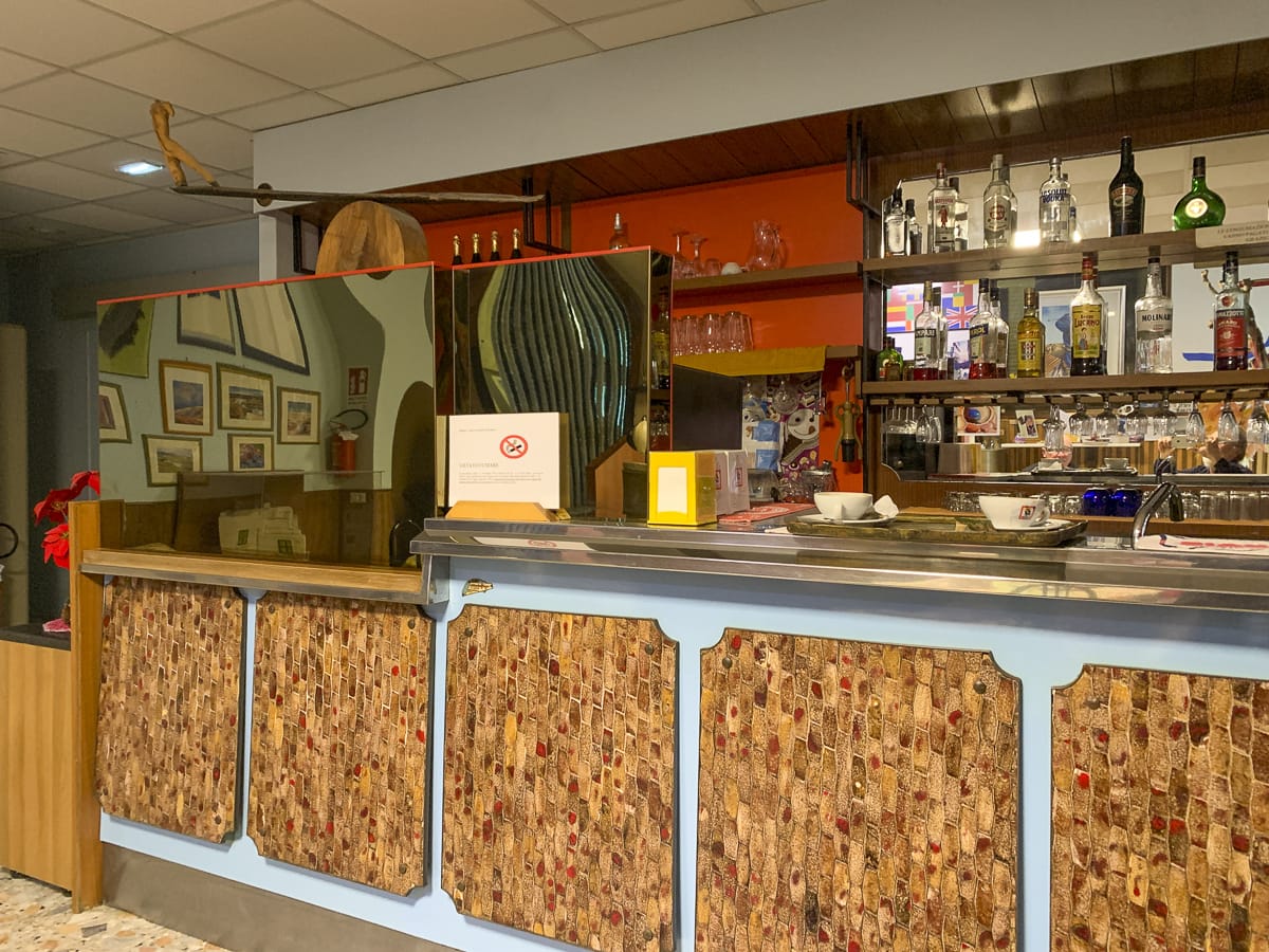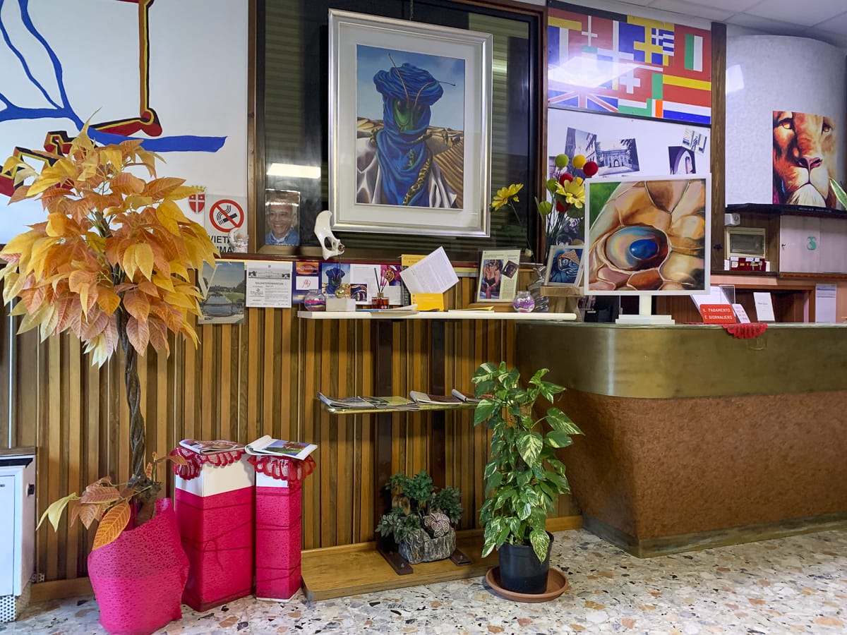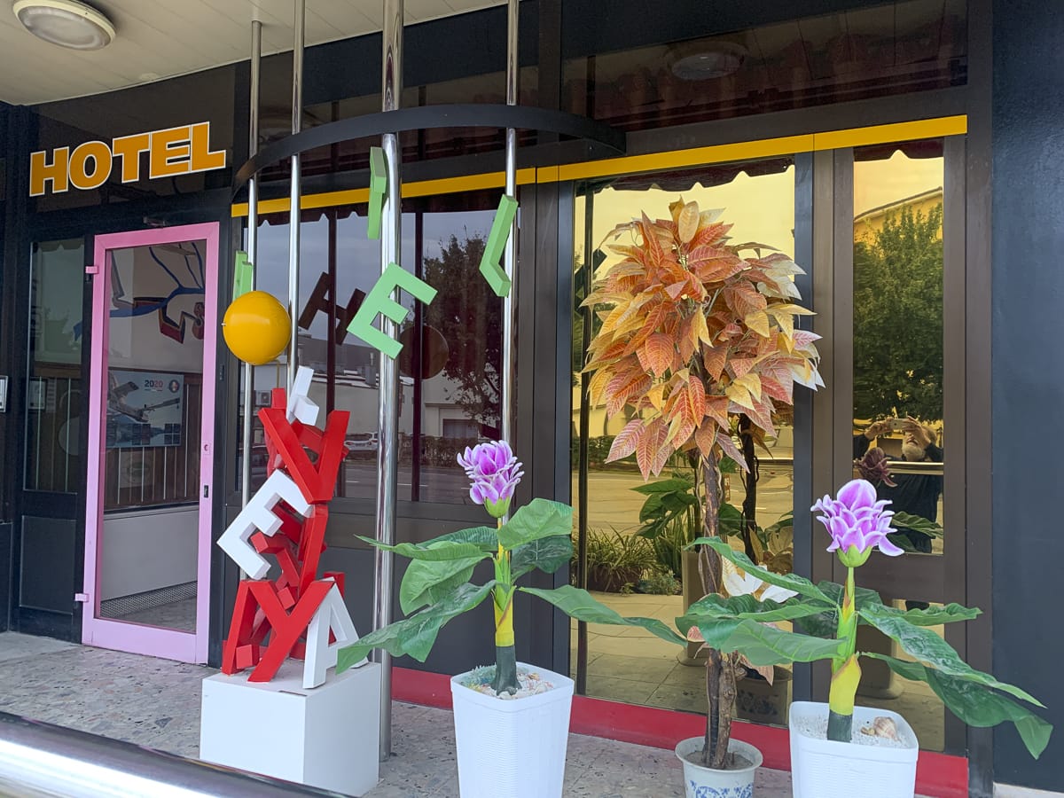 Schon am Eingang begrüßen uns seltsame Kunstobjekte, garniert mit Plastikblumen. An der Rezeption eine welke Schönheit mit eigenartigem Kommunikationsverhalten, die Einrichtung erinnert an Magical Mystery Tour, sie hat interessantere Tage erlebt. Überall hängen Bilder und stehen Kunstobjekte in psychedelisch wirkenden Farben, eine wertige, aber aus der Zeit gefallene Bar im Hintergrund. Es stellt sich heraus: Der Hotelier ist tatsächlich der Urheber all dieser Werke. Vor dem Haus steht der ikonische VW-Bus aus den frühen Siebzigern in Blau-Violett-Pink. Wieso die Hütte „Zu den drei Heiligen“ heißt, kann nur spekuliert werden: 😉
