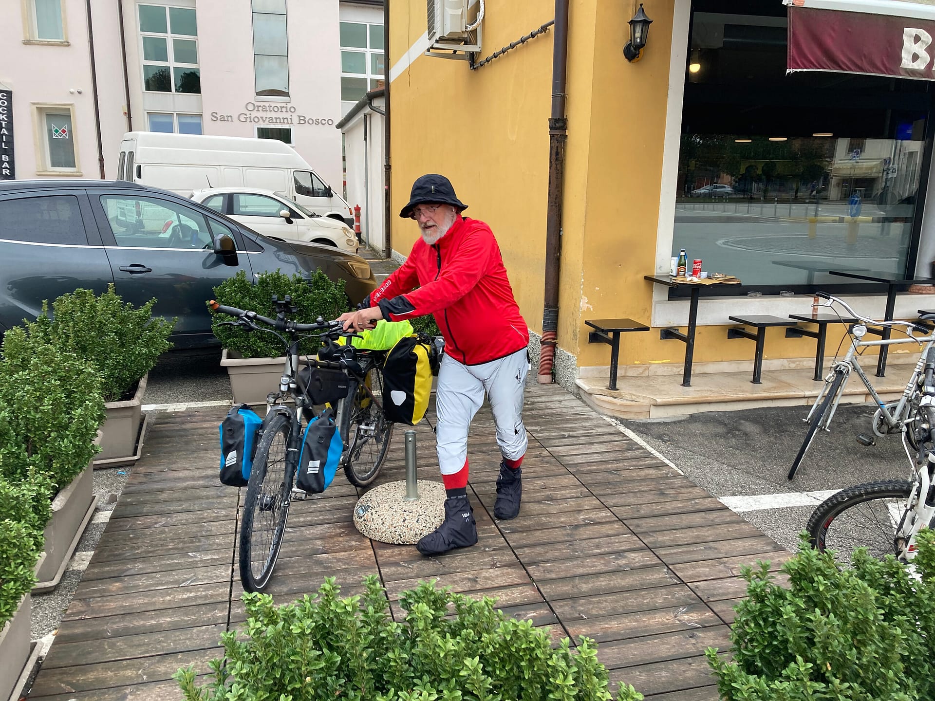 In Fontaniva genehmigen wir uns einen Toast, im Lokal ein heftiger Streit, der beinahe in Handgreiflichkeiten ausartet. Das Regengewand wird ausgepackt und ein Zimmer gebucht.