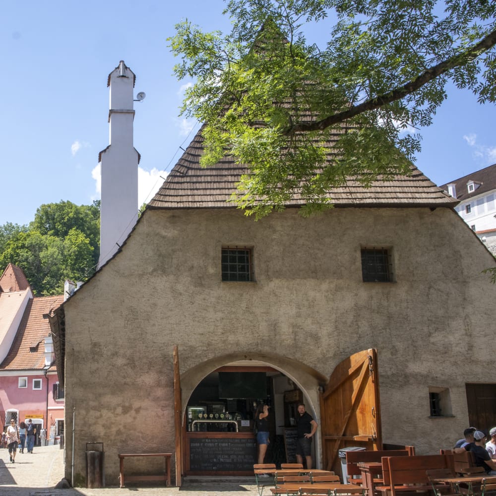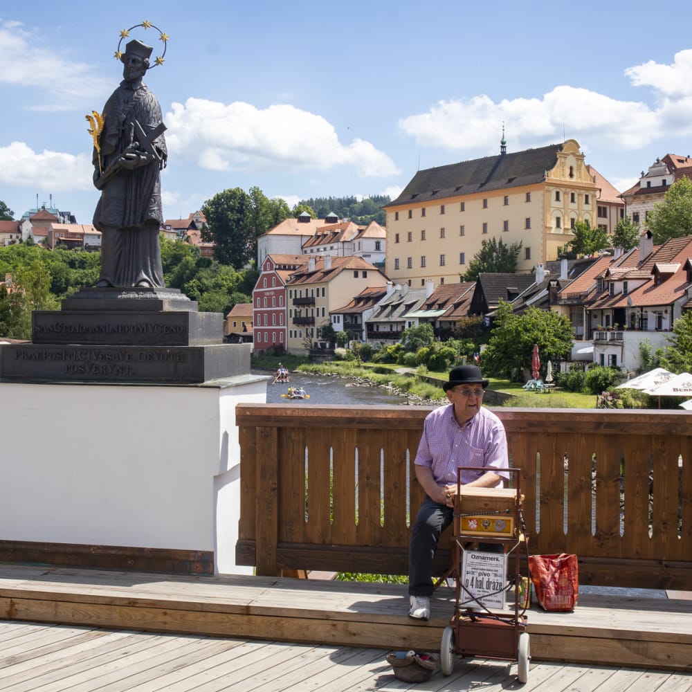 Ein Wiedersehen mit Krumau… D. wartet schon auf den Nachkömmling, einen schönen Beerendrink in der Hand, nach den Brückenbögen gleich links nach der Holzbrücke.