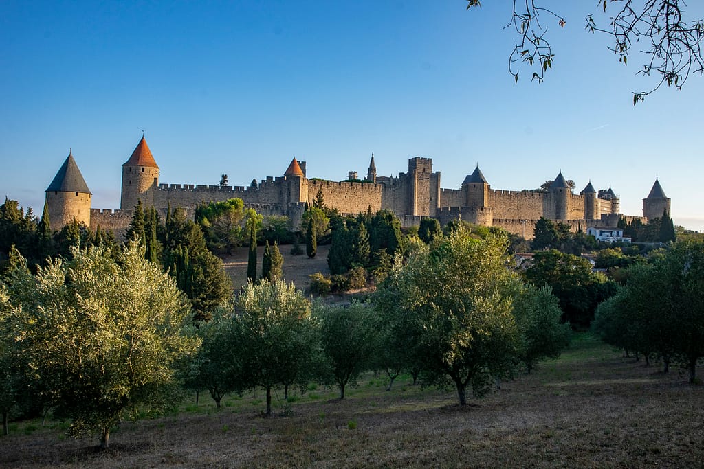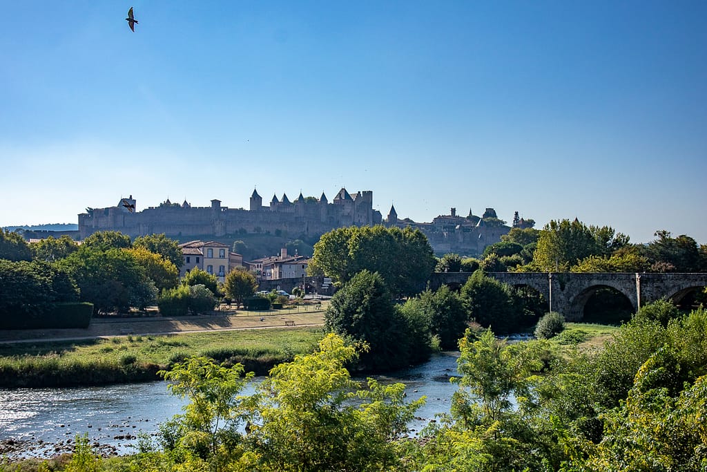 Es hat sich bewährt: Früh austehen, ein schnellen Kaffee und dann Besichtigung. So lasse ich also mein Zelt stehen und mach mich zur Cité auf. Und werde mit wunderbaren Blicken auf die Altstadt belohnt. Obwohl ich weiß, dass die Stadt im 19.Jahrhundert ziemlich verfallen war und von Eugène Viollet-le-Duc ab 1853 (recht brutal) restauriert wurde, obwohl die Stadt jährlich von Millionen Besucher:innen überschwemmt wird. Angeblich wohnen noch an die 200 Menschen innerhalb der Mauern. Im Mittelalter waren es 3.000 bis 4.000. Alles andere ist Kulisse – aber welche! Und natürlich: Weltkulturerbe.