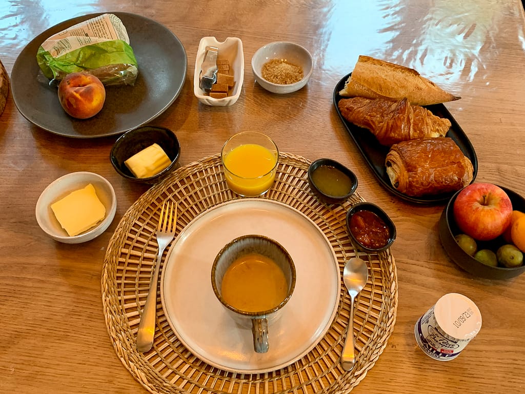 Die Madame des Hauses Les Tanalis, 3 Rue de la Mairie, Gurs hat mir ein wunderschönes Petit Déjeuner vorbereitet. Und verschwindet diskret, um mich in aller Ruhe genießen zu lassen. Beim Einpacken ein längeres Gespräch mit dem Monsieur über Radln und die Geschichte des Hauses. Dieses stammt aus dem 19.Jahrhundert und war zuvor eine Post-Relaisstation zum Pferdewechsel.