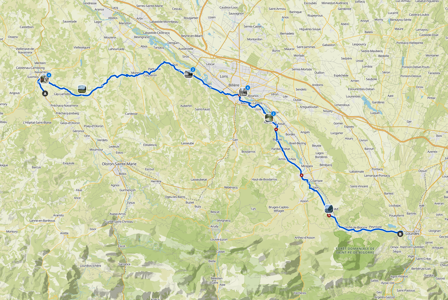 Lestelle-Betharram – eine weitere Überraschung. Die Genossenschaft der Priester des Heiligsten Herzens Jesu, gegründet in den 30er-Jahren des 19.Jhs, haben hier ihren Sitz, der einen Großteil des Ortes einnimmt. Auch ein berühmtes Höhlensystem gibt es, die Grottes de Bétharram. Kurz danach beginnt die Region Occitanie, ich verlasse Nouvelle Aquitaine.