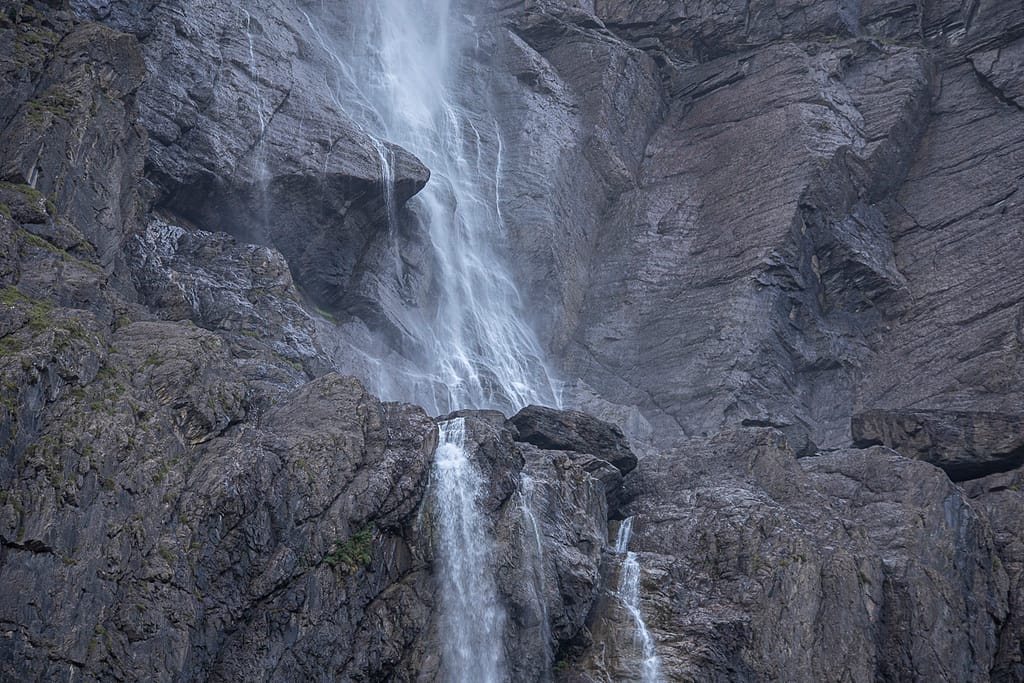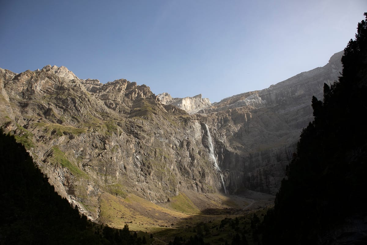 Leider wird es nichts aus dem Morgenrot, die Sonne erreicht den Talboden nicht, die Luft ist feucht und diesig. Der Anblick des Talrunds, des höchsten Wasserfalls Europas und die absolute Stille ist dennoch beeindruckend. Die Berge dahinter sind über 3.000 Meter hoch, sie bilden auch die Grenze zu Spanien.