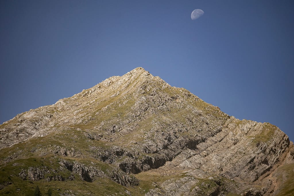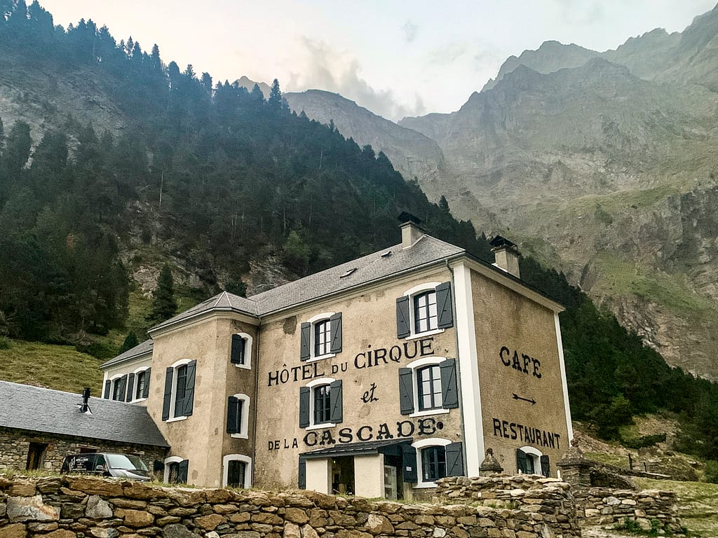 5:00. Nach einer längeren Betrachtung des abnehmenden Monds und einem Kaffee mache ich mich auf, ich will vor Sonnenaufgang im Cirque sein. Dorthin führt nur ein Wanderweg, ca. eine Stunde dauert es bis zum Talschluss. Einen Teil mit dem Rad, dann zu Fuß. Keine Autos, wie schön! Und am Ende bloß ein einziges, in die Jahre gekommenes Hotel. Sonst: Natur. Langsam wird es hell.