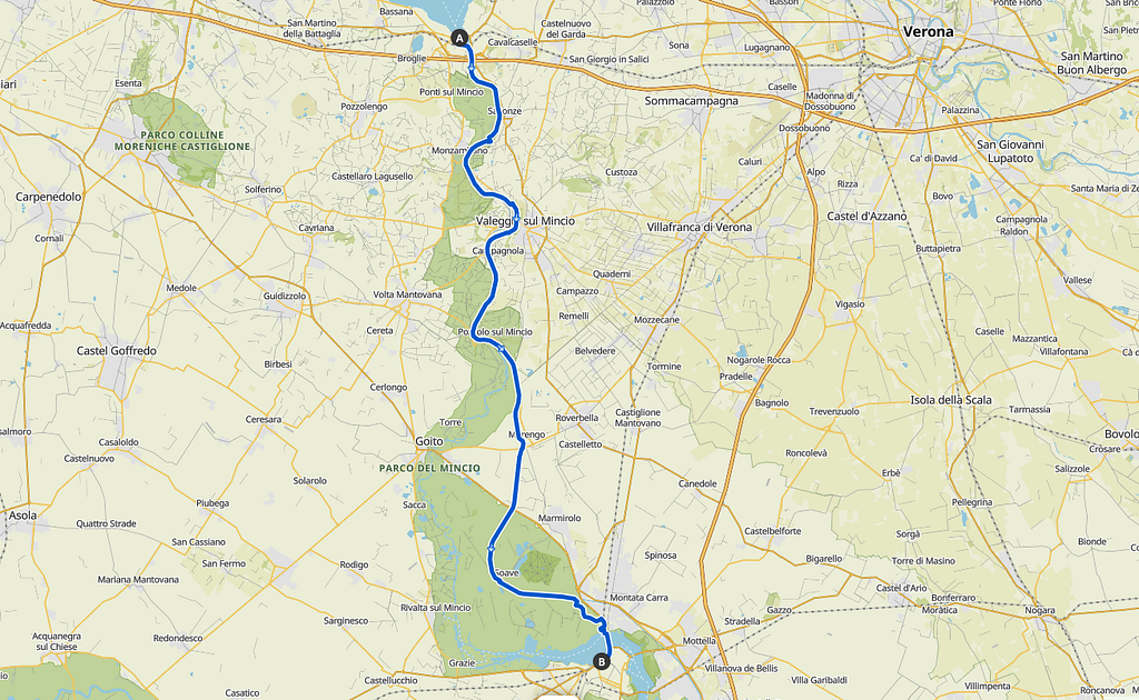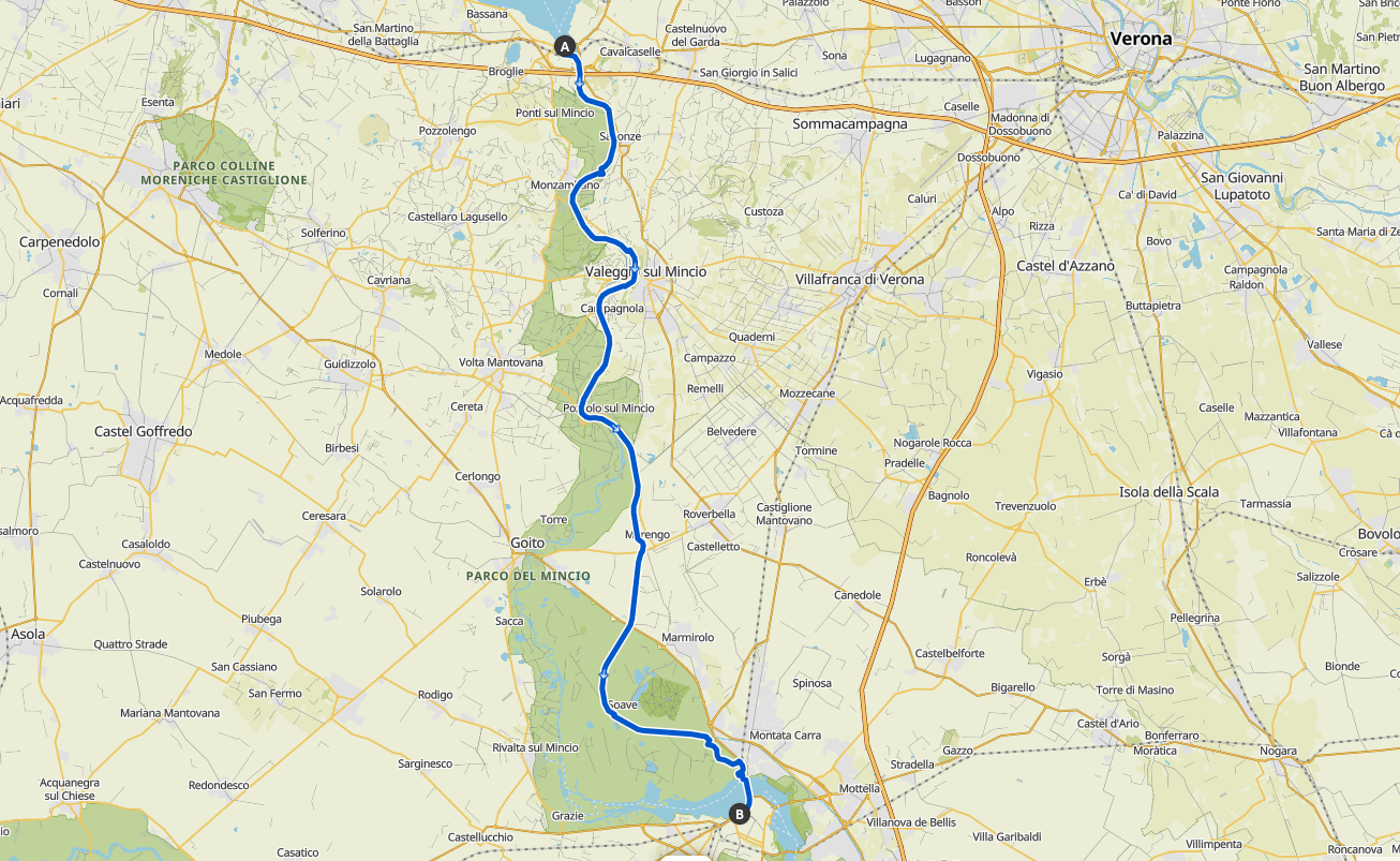 Mit dem Zug über Verona nach Peschiera del Garda. Wir wollen über das Mincio-Tal nach Mantua. Dort mag es zwar sommers nach Minzen duften, aber Name das Flusses hat damit nichts gemein.
