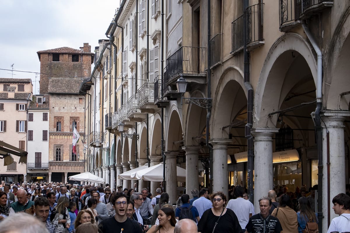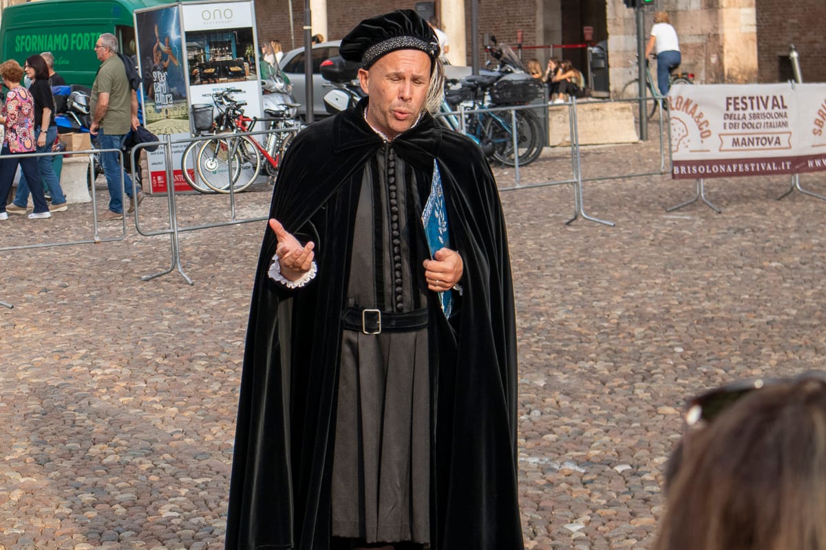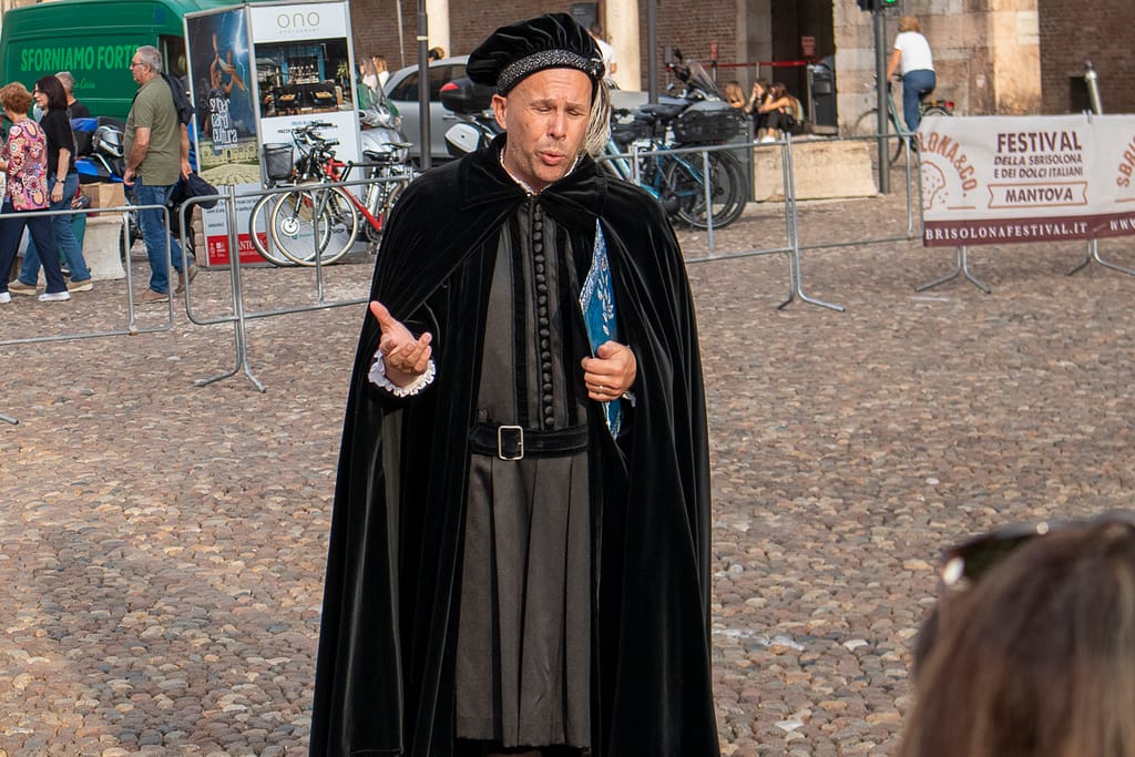 Bald wird klar, dass wir gerade zurecht zum Fest der Sbrisolona (ein Mandelkuchen). Ein städtischer Würdenträger tritt auf, danach kommt ein Zug, begleitet von Fanfaren und Trommeln und Fahnenschwingern. Ihnen folgen Bürger:innen in historischen Kostümen. Es ist fast kein Durchkommen mehr, das Rad muss abgestellt werden.