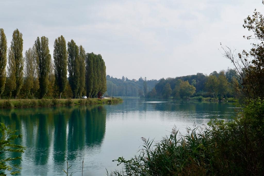 Ein Cafè muss aber sein, beim kleinen Standl mit Blick auf den See. Danach geht es los, durch die Auen, zu Beginn sehr schön, mit türkisem Wasser, später unspektakulär. Ein Imbiss bei Chiosco dei Mulini – zu empfehlen, gute Wahl.