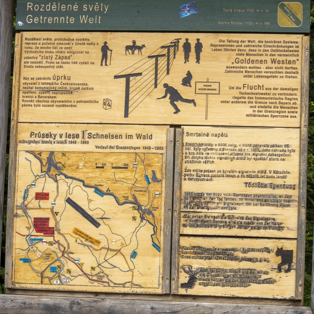 In Kvilda / Außergfield treffen wir auf ein Lokal, erschöpfte Schüler:innen in großer Zahl, ein wenig touristische Infrastruktur und die Moldau. Wenigstens eine der vielen Moldauquellen muss ich gesehen haben. Also 7 km bergan zur Quelle der „Warmen Moldau“, nicht weit davon die Grenze zu Deutschland, ehemals Eiserner Vorhang.